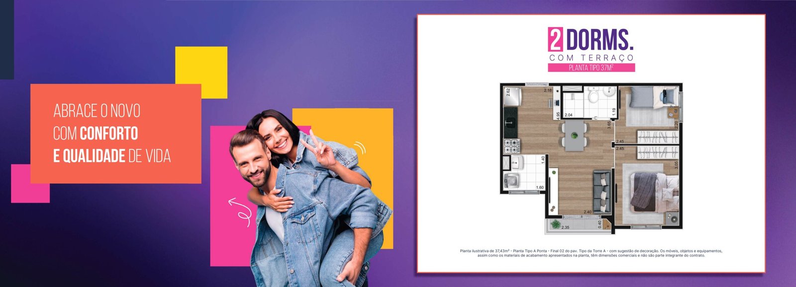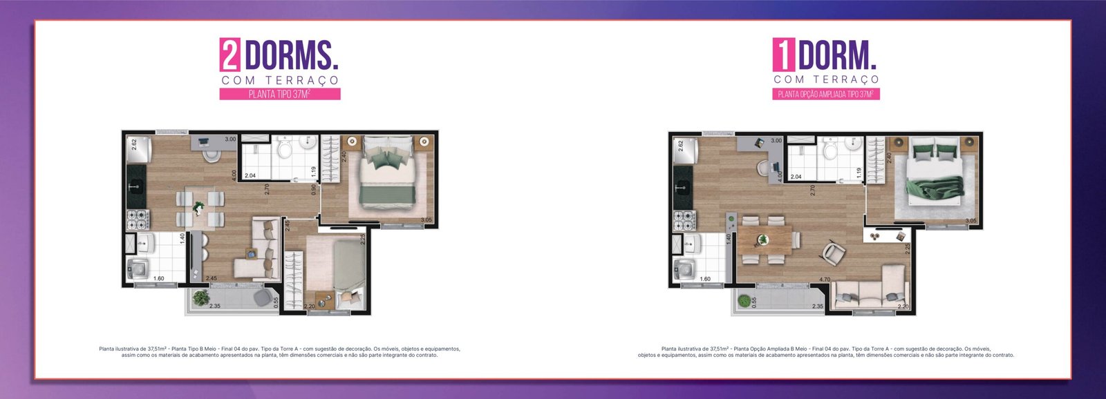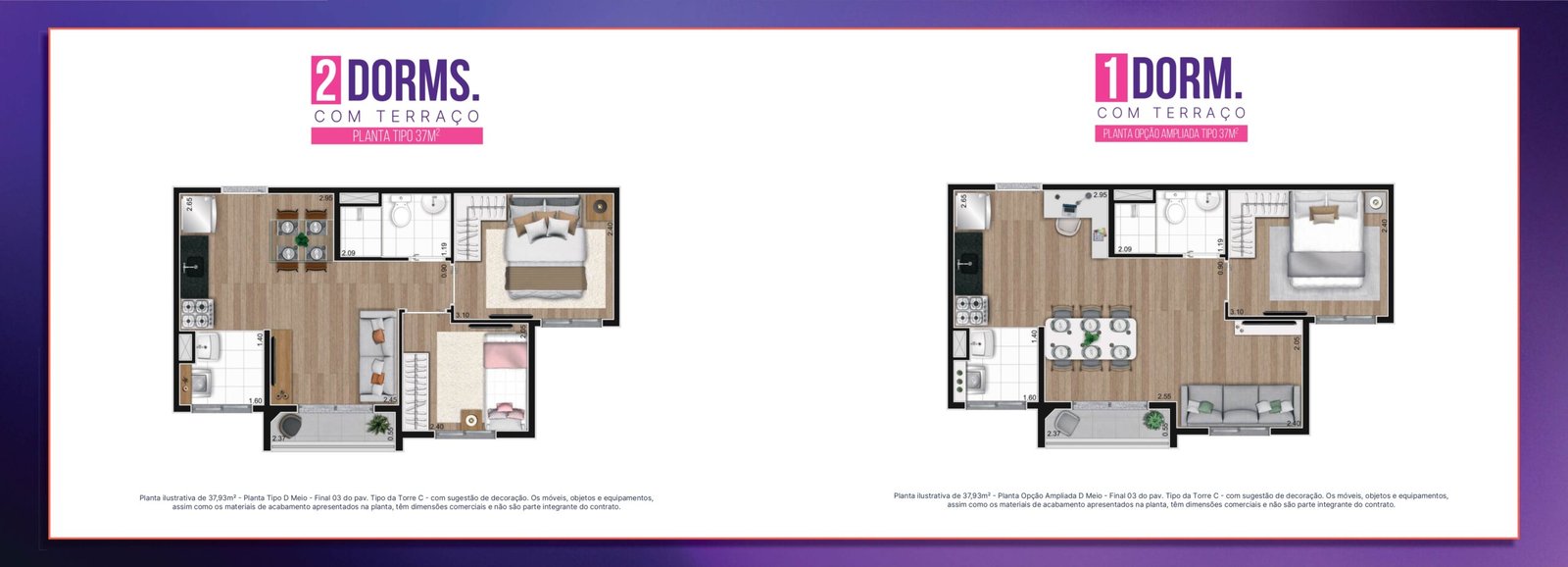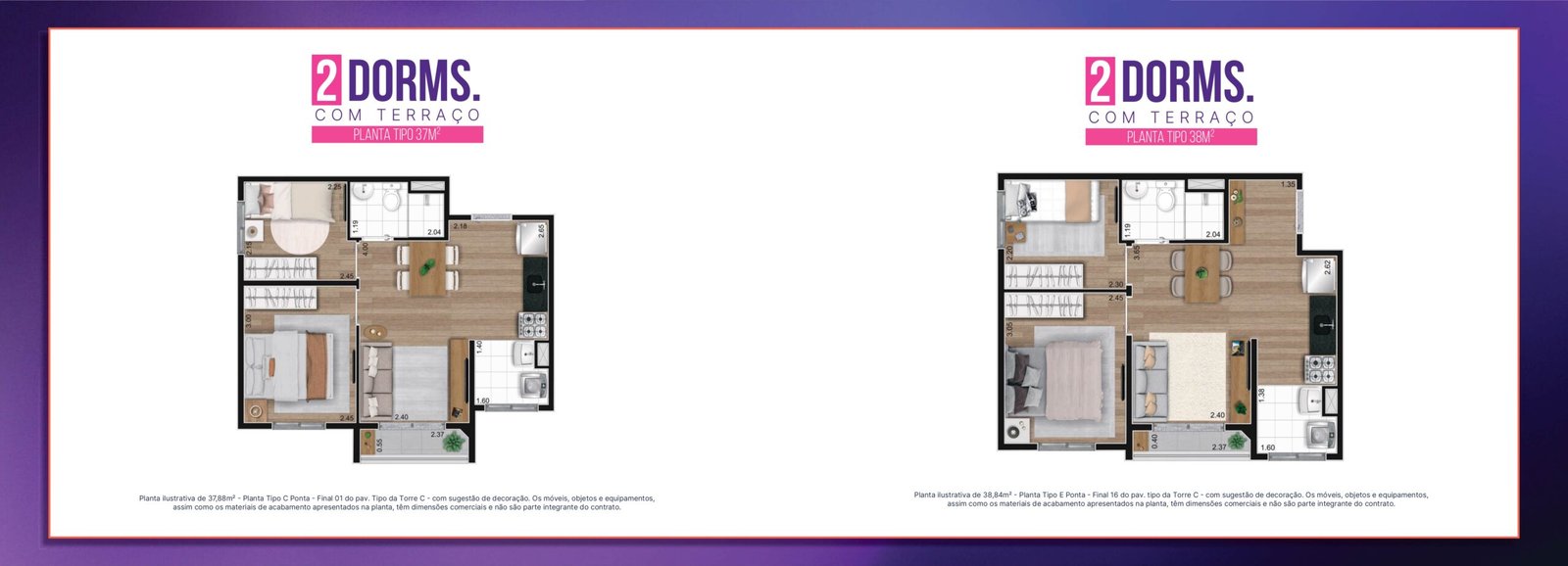 Apartamentos de 37m² e 38m²: Projetados para aproveitar cada centímetro. São 2 dormitórios com excelente distribuição interna.